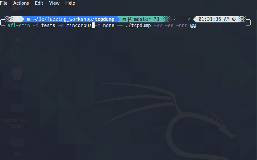 afl-cmin –i tests –o mincorpus –m none -- ./tcpdump –vv –ee –nnr @@你应该看到一个类似下面的截图: