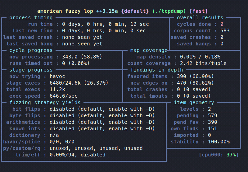 afl-fuzz –i mincorpus –o fuzzoutput –m none -- ./tcpdump –vv –ee –nnr @@你应该看到这样的情况: